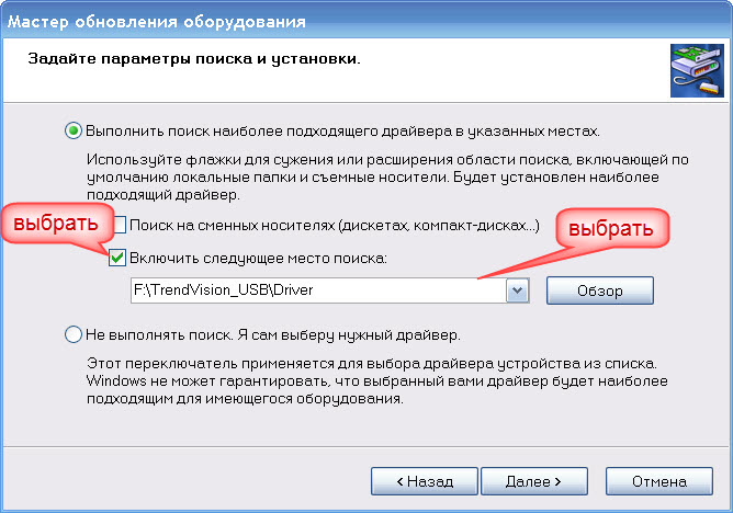 6. Выбрать пункт «Включить следующее место поиска». Выбрать место, где хранится сохраненная папка TrendVision_USB/Driver и нажать на кнопку «Далее».